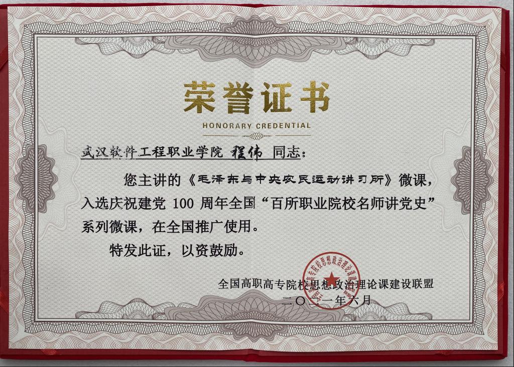 (通讯员:叶玉姝)6月19日上午,全国高职院校“喜庆建党百年”百名名师讲党史总结大会在延安职业技术学院大学生活动中心举行。我院程伟老师录制的优秀作品《毛泽东与中央农民运动讲习所》党史学习教育微课成功入选庆祝建党100周年全国“百所职业院校名师讲党史”系列微课,并在全国推广使用。