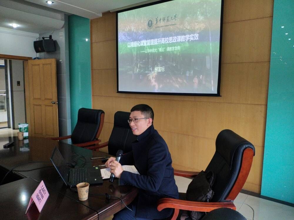 (通讯员:夏文婷)为了进一步提升思政课教学实效,推动改革创新,11月11日下午,我院特邀华中师范大学马克思主义学院“毛泽东思想和中国特色社会主义理论体系概论”教研部部长、“同课异构·协同共研”思政课教学创新联盟副秘书长熊富标副教授来校开展题为《以精细化课堂管理提升高校思政课教学实效》的讲座。马克思主义学院党总支书记张国华、副院长肖国香、全体专兼职思政课教师到场聆听,讲座由肖国香主持。