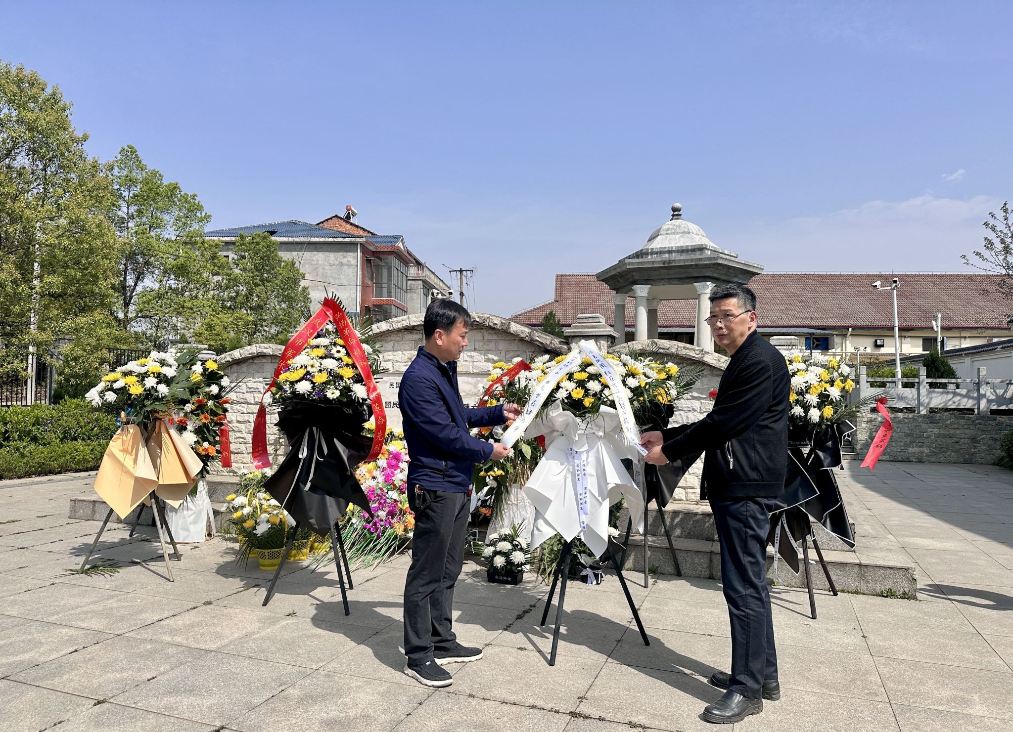 我校马院党总支书记张国华与江夏区凤凰社区党委书记裴治国整理花篮和挽联