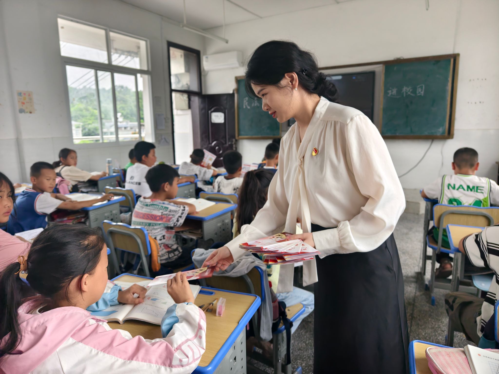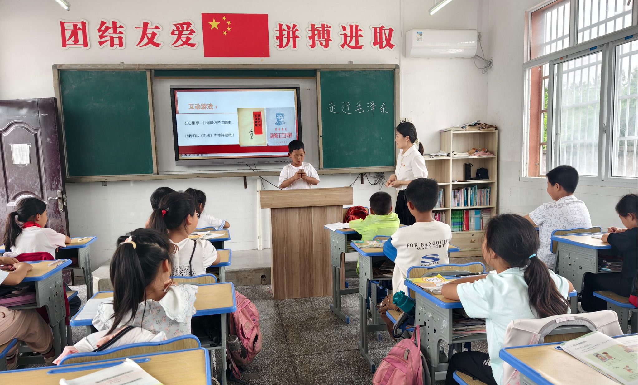 在枫洞小学教室里,石紫薇老师说道:“毛泽东常说:‘饭可以一日不吃,觉可以一日不睡,书不可以一日不读。’读书是他一生的爱好。”激励孩子们好读书、读好书。石紫薇老师以“走近一代伟人毛泽东”为题,通过讲述毛泽东同志生平事迹、提问交流、游戏互动等形式,带领孩子们重温毛泽东同志的成长历程与革命精神,帮助广大青少年树立正确的世界观、人生观、价值观,“扣好人生第一粒扣子”。同学们踊跃参与,现场气氛热烈。