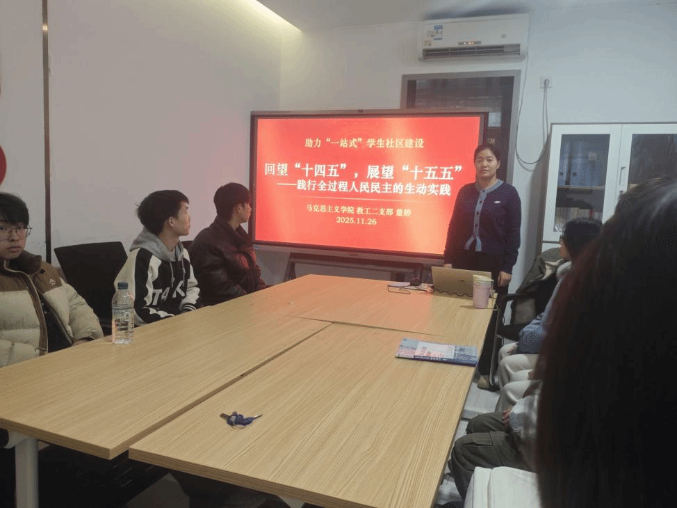 (通讯员:董婷)为助力我校“一站式”学生社区建设,进一步丰富学生的精神文化生活,提升学生的思想认知水平,2025年11月27日,马克思主义学院第二党支部的党员教师董婷在12栋信息学院一站式学生活动中心开展了一场意义非凡的红色讲堂教育活动。此次活动以“回望‘十四五’,展望‘十五五’——践行全过程人民民主的生动实践”为主题,旨在引导学生们深入了解国家的发展规划,深刻领会全过程人民民主的内涵与价值。