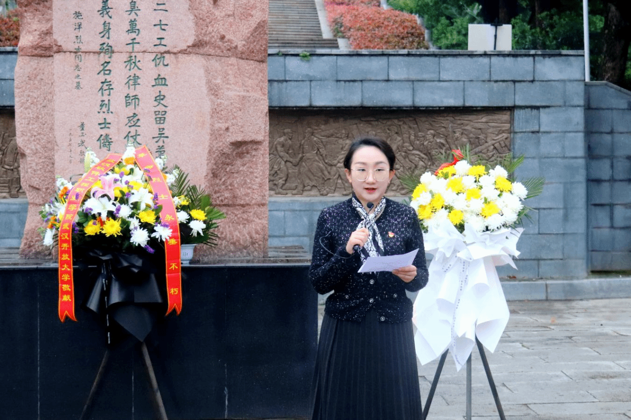 (通讯员:米依农)春草萋萋怀忠烈,清风徐徐寄哀思。为深入开展“行走的思政课”实践教育,赓续武汉红色文化血脉,厚植青年师生爱国情怀,用好武汉本土红色资源,3月31日上午,学校关工委、团委联合组织关工委成员、第28期“青马工程”学员、团干教师代表赴施洋烈士陵园开展“缅怀先烈忆初心,传承精神担使命”清明主题祭扫活动。我院青年教师米依农作为教师代表参与活动,立足红色场馆开展现场教学,让思政教育走出课堂、走进现场、直抵人心。