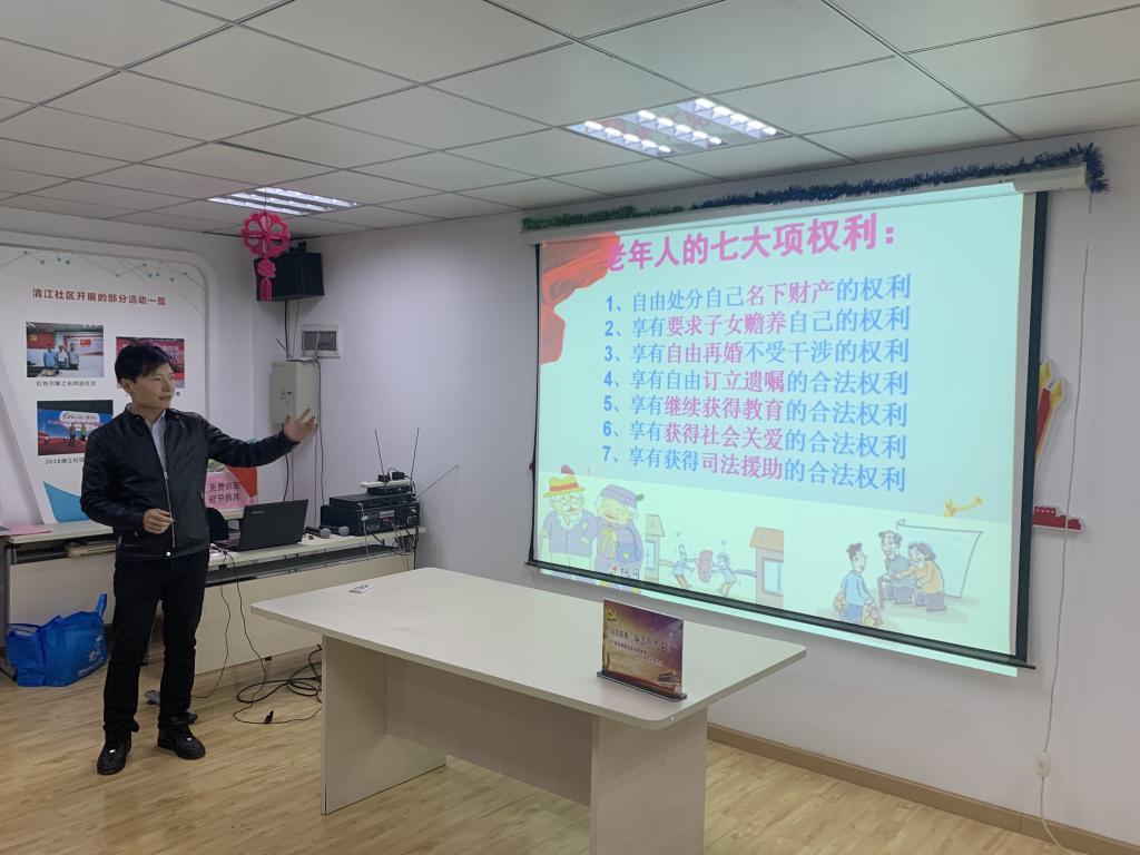 本次普法宣讲人是党员教师朱海,他也是一名律师。朱海老师为清江社区党员群众们重点讲解了四个问题:一是老年人权益保护法主要条款;二是继承法主要条款及案例;三是借条和欠条的区别;四是订金和定金的区别。这些问题都是围绕社区老人权益保护和日常问题展开,非常有针对性。居民群众们听后纷纷表示非常受益,并希望以后能多举办一些类似的宣讲活动。