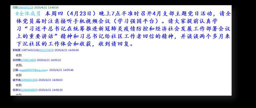 袁芳逸老师巾帼不让须眉,作为此次下沉社区的优秀党员代表率先发言。作为两个孩子的妈妈,还处在哺乳期的她,原本可以不下社区,但她还是毅然加入了抗疫队伍。在2月7日学校接到建设临时隔离点的任务,她连续多日投入“战斗”,还主动接送其他交通不便的老师,每次都最晚离校。2月15日,她下沉到洪山区南湖山庄社区,她带领另外3名志愿者排查500多户,原计划3天完成的排查工作,1天就顺利完成。之后又加入社区团购工作,还多次充当“苦力”,有一次,她和社区其他工作人员一起卸了1000斤泥蒿、390斤鱼。她说:“每天奔波在外,说不担心自己的健康安危是假的,但作为一名党员,在抗击疫情的紧要关头,我应该挺身而出”。