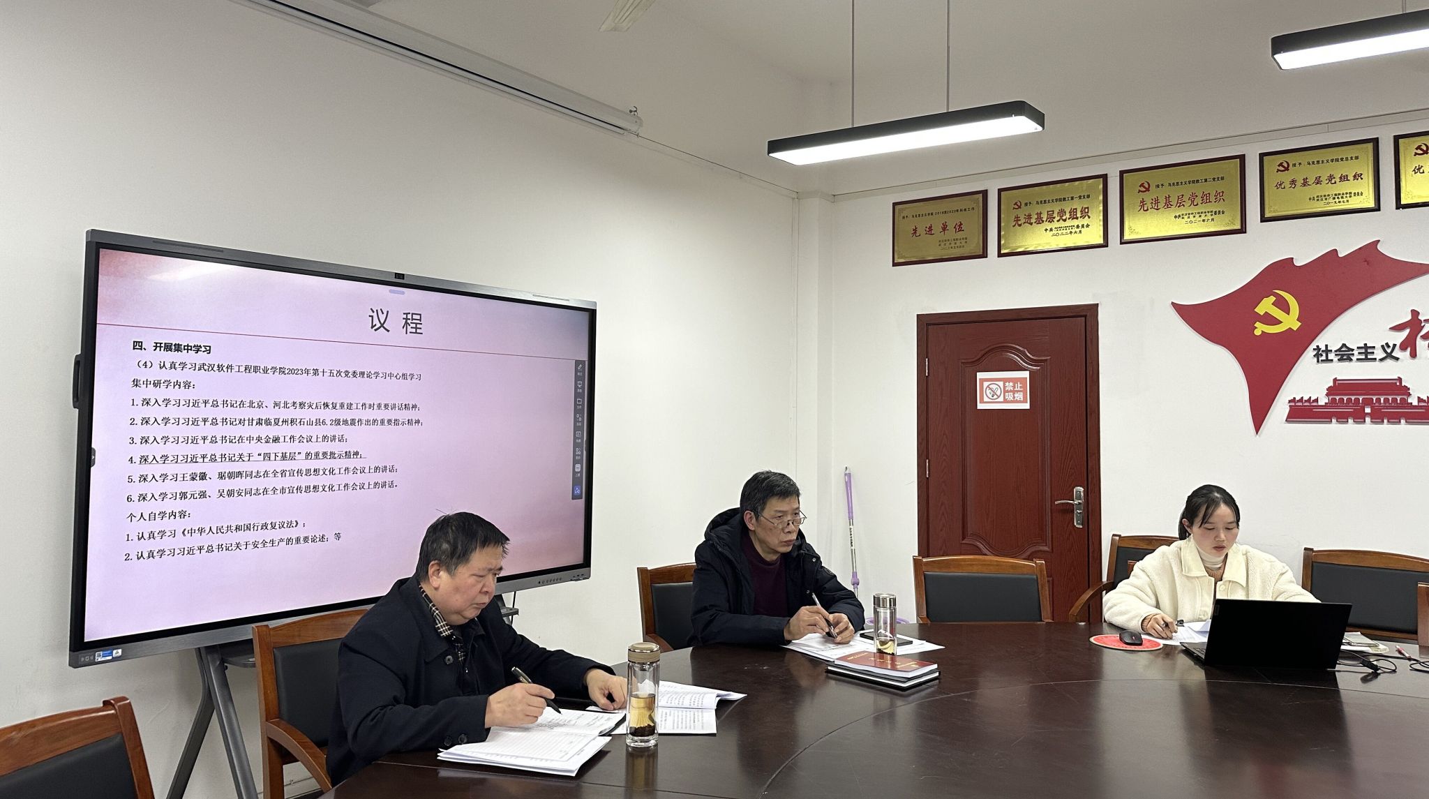 随后,支部书记郭晓雯带领全体党员开展集中学习:一是认真学习贯彻习近平总书记近期重要讲话和重要指示批示精神;二是认真学习贯彻省、市有关重要会议精神;三是 “落实在一线”系列评论;四是认真学习武汉软件工程职业学院2023年第十五次党委理论学习中心组学习集中研学内容。