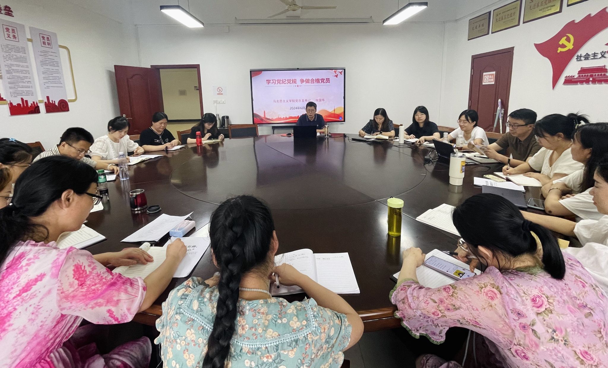 张国华书记从习近平总书记关于党纪学习教育的重要讲话和重要指示精神、2024年党纪学习教育重点、学习贯彻新修订的《中国共产党纪律处分条例》、遵守党纪做合格党员四个方面为学院党员教师们全面解读党纪学习教育的重要性、主要内容和学习要求。张书记强调,党纪学习教育是加强党的纪律建设、推动全面从严治党向纵深发展的重要举措,党员们在思想境界上要强化四种意识、在道德修养上要做到“五慎”。