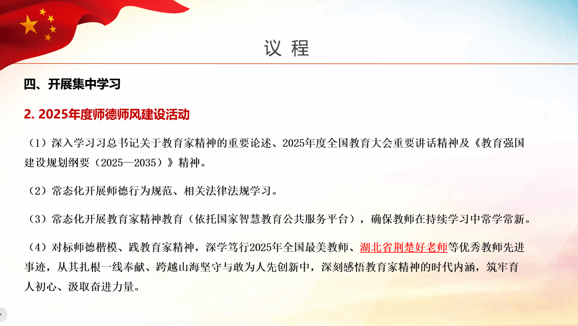 根据学校2025年度师德师风建设活动内容与要求,本次“支部主题党日”活动专题开展教育家精神大学习大宣讲活动。全体党员认真学习2025年全国最美教师、湖北省荆楚好老师等优秀教师先进事迹,并围绕教育家精神的核心要义,结合自身教学实践,分享学习心得。谢开磊指出,教育家精神不仅是理念,更应落实在日常教学与学生关怀中。党员教师们纷纷表示,将以教育家精神为指引,提升思政教学水平,创新教学方法,关注学生全面成长,在教育教学中发挥先锋模范作用,努力成为有理想信念、有道德情操、有扎实学识、有仁爱之心的“四有”好老师。