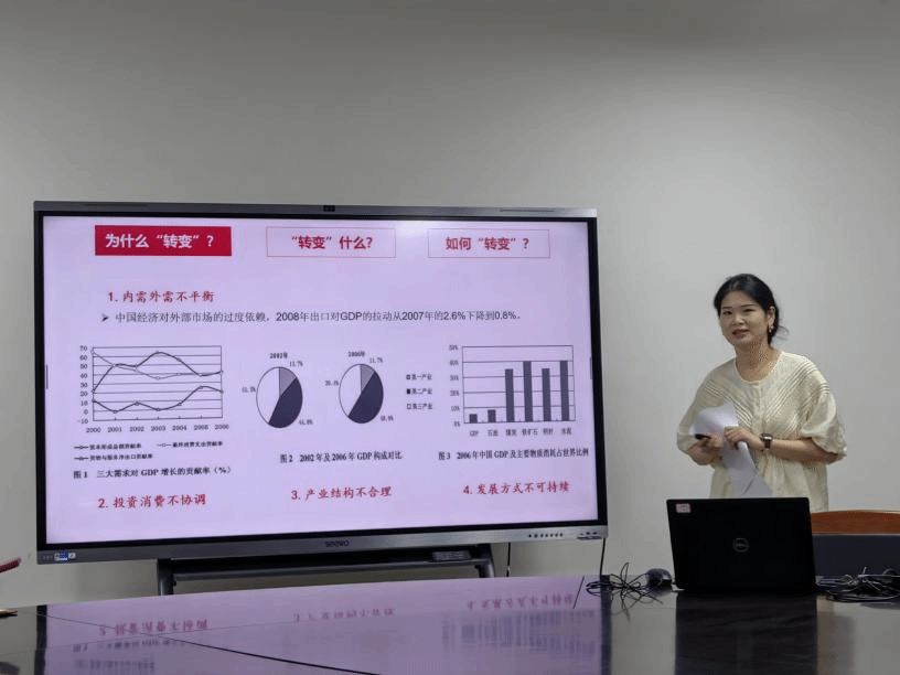 韩莹老师针对“如何加快转变经济发展方式”,先以 GDP 增速、出口拉动率数据点明“转变”必要性,对比“经济增长与发展方式” 差异,再依据党的十七大报告拆解“三个转变”要求,结合北斗导航、青藏铁路等案例,阐释“全面深化经济体制改革”“实施创新驱动发展战略”等七大实践路径,形成完整的“问题—理论—方法—案例”教学链条。