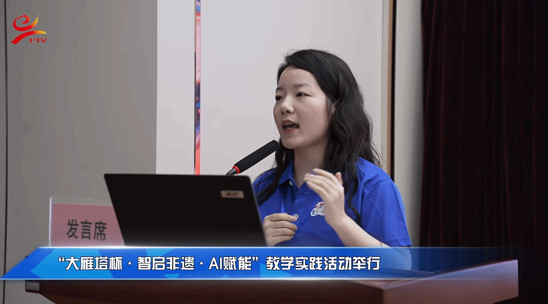 在颁奖仪式的经验分享环节,喻玲老师作为优秀参赛教师代表登台发言,从作品创意孵化、非遗元素挖掘、AI技术应用到教学实践结合等多个维度,详细介绍了创作过程中的思考与心得。她提到,马克思主义学院始终注重将中华优秀传统文化与思政教育、现代科技相融合,此次作品创作正是基于学院“以文化人、以技赋能”的教学理念,通过AI技术让非遗文化“活起来”,既丰富了教学实践形式,也为非遗传承注入了新活力。其分享内容详实、思路独特,为其他参会单位开展非遗AI融合教学提供了宝贵参考,引发在场师生的强烈共鸣。